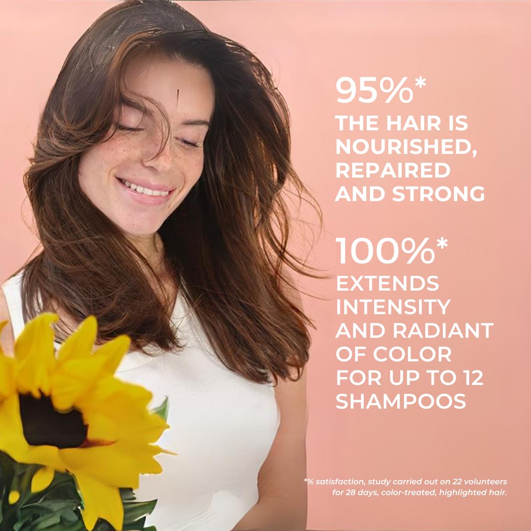 The COLOR Mask prolongs the shine and intensity of color while repairing hair damaged by coloring. Hair is left shiny and color remains luminous for up to 9 weeks**. At the heart of the formula is a rice peptide complex that preserves color intensity and shines over the weeks. Tara tannins and young sunflower shoots protect the color. Karanja oil adds nourishment to the hair. An extraction of white mallow makes hair twice as shiny.
