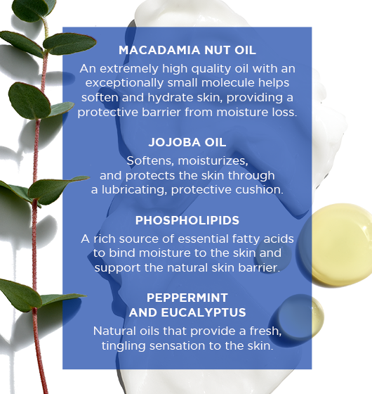 - Macadamia Nut Oil: An extremely high quality oil with an exceptionally small molecule helps soften and hydrate skin, providing a protective barrier from moisture loss.