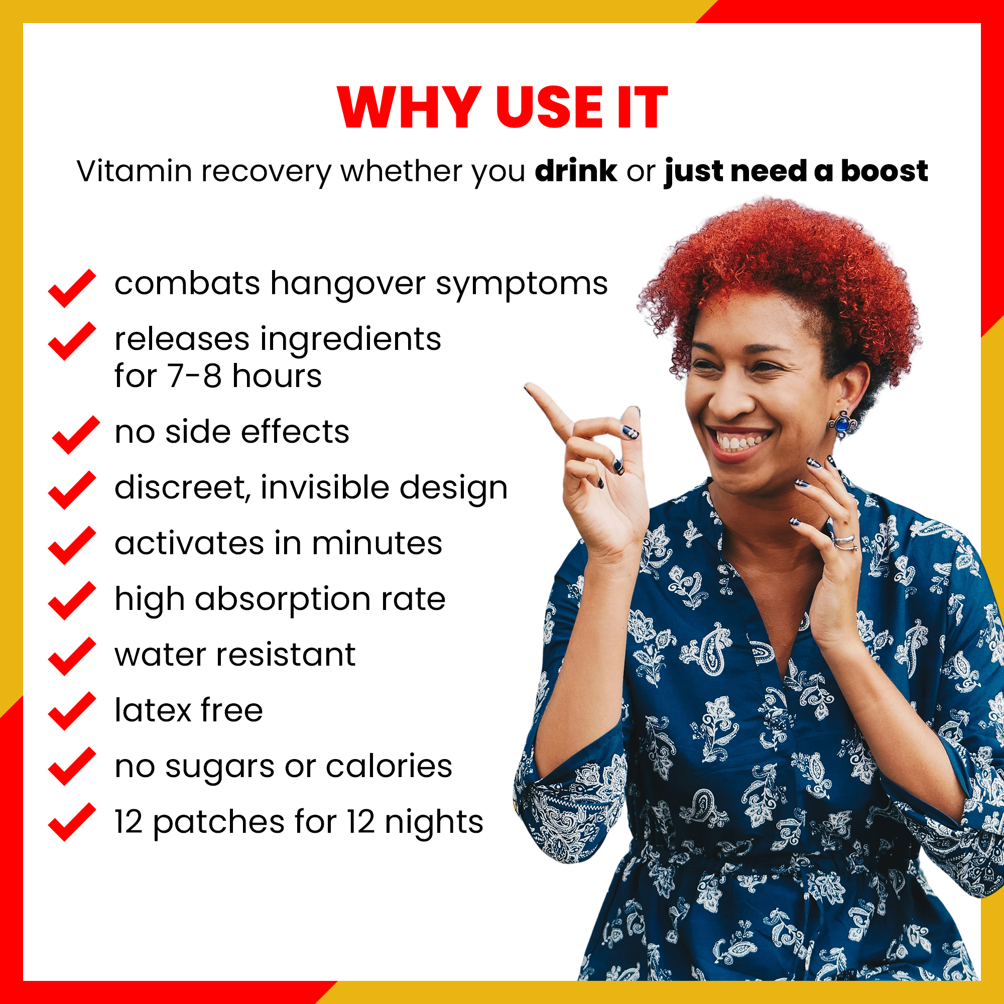 Infused with a powerful blend of vitamins, antioxidants, and natural extracts, our patches steadily release ingredients into your body to help reduce hangover symptoms by replenishing essential nutrients, boosting energy, and enhancing cognitive function. Discreet, simple and with no side effects, these water-resistant patches have you covered whether you're celebrating a big night out or need to stay sharp the next day!