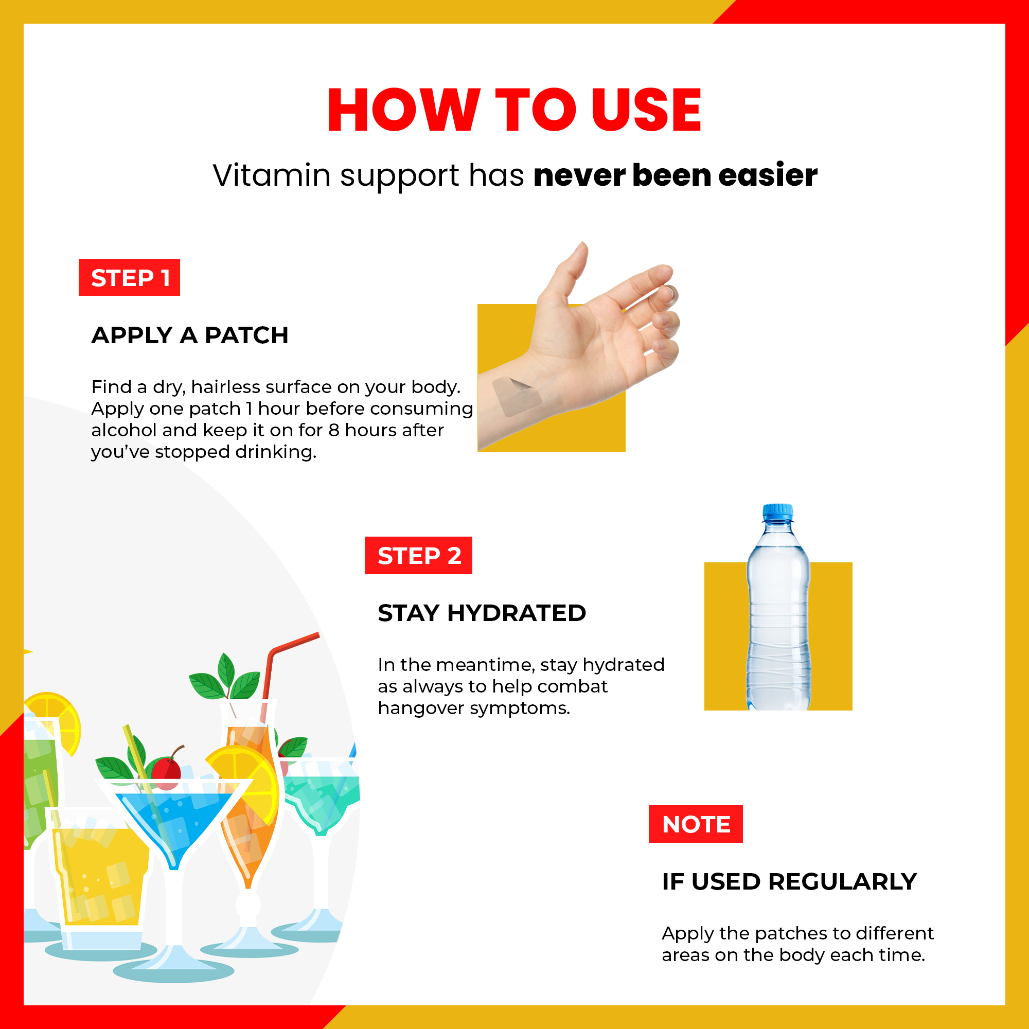 Step 1 - Apply Patches: Find a dry, hairless area on your body. Apply one patch one hour before consuming alcohol and keep it on for 8 hours after you've stopped drinking.