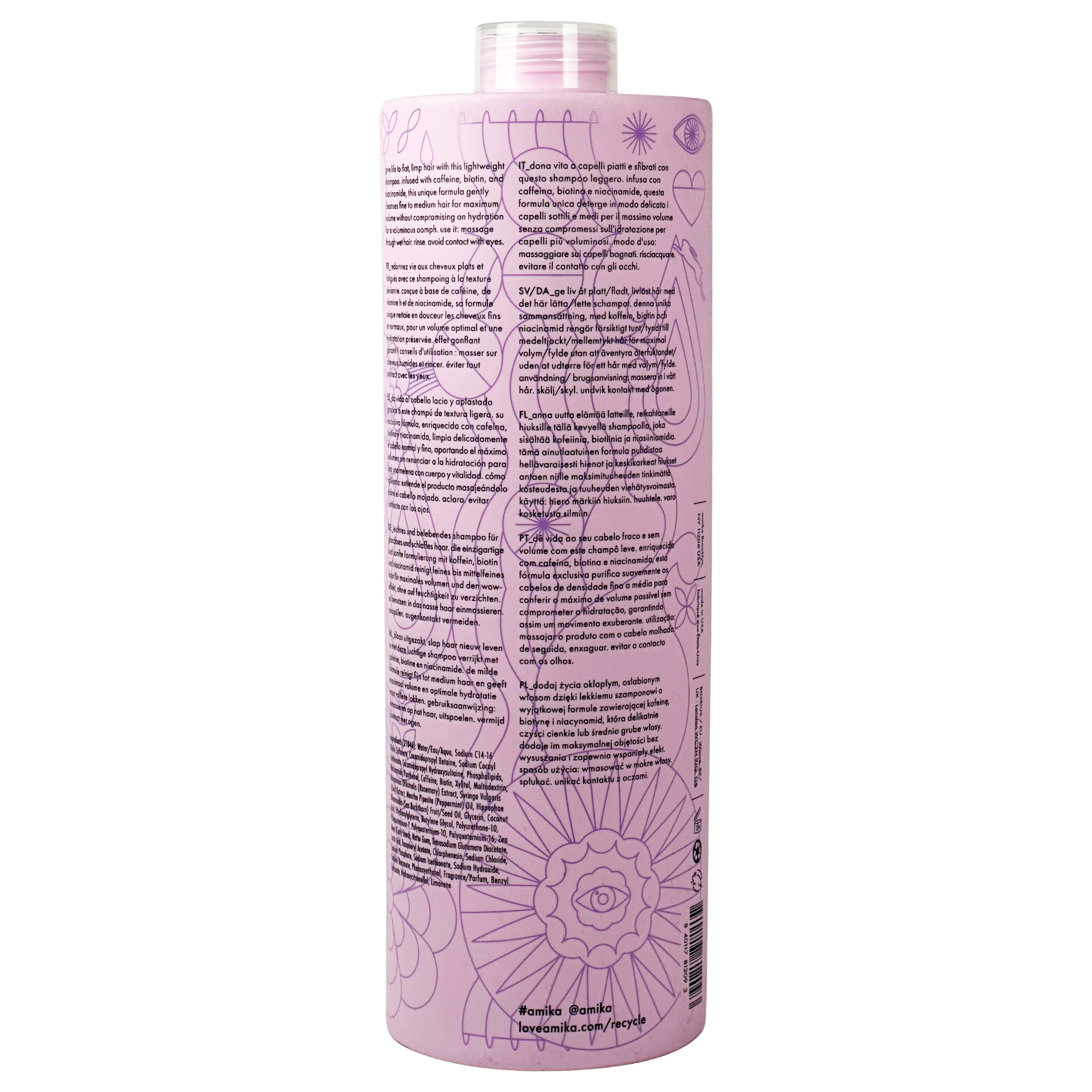 - iconic volume, the amika way: infused with caffeine to energize flat strands + send limp hair home.