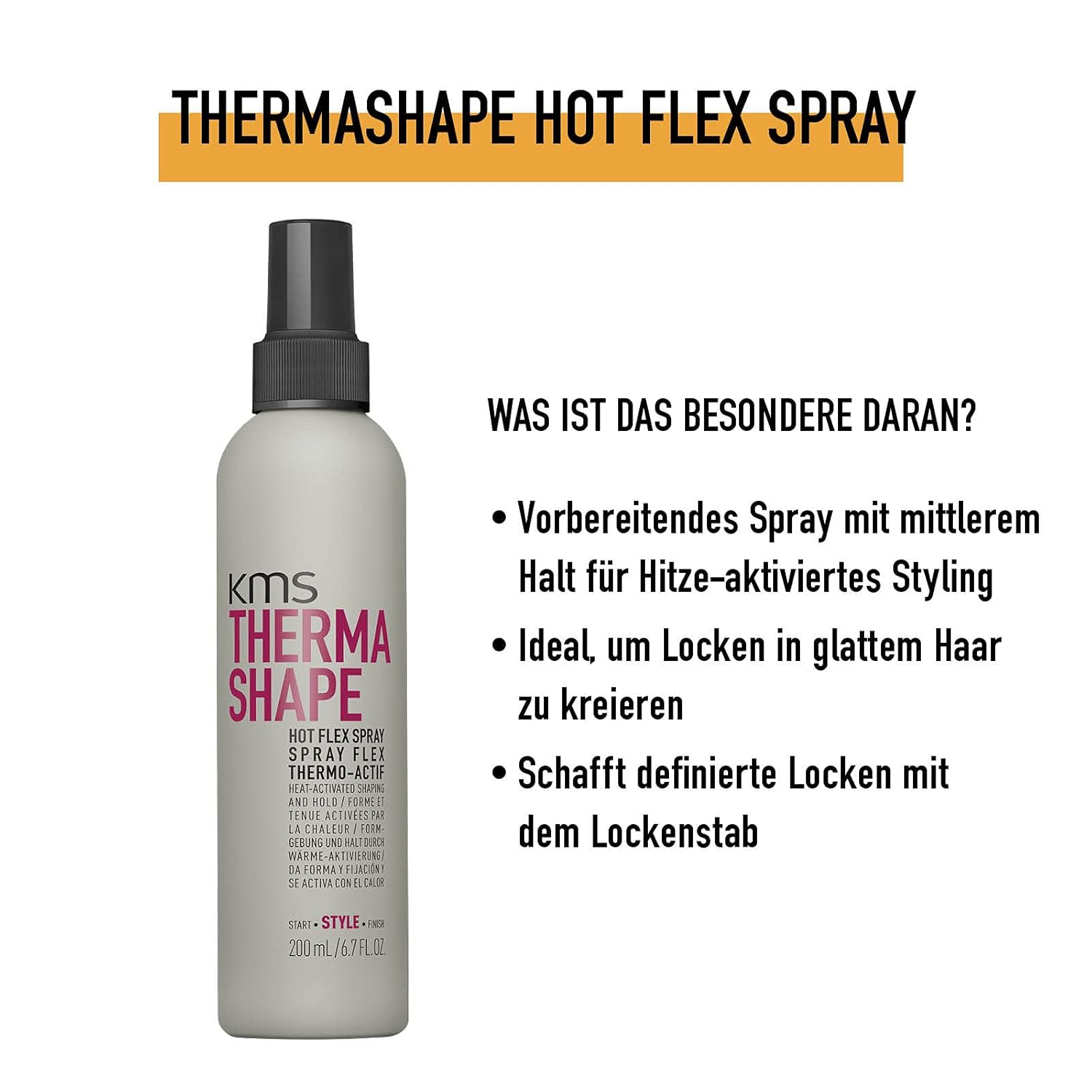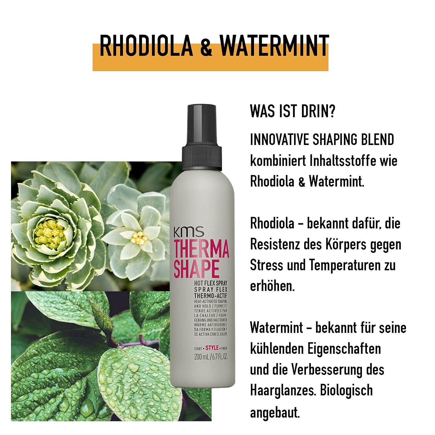 This fragrance combines scents of the forest, paired up with citrus fruits and flowers. KMS THERMASHAPE Hot Flex Spray is ideal for curl creation, especially in straight hair. Formulated with a Innovative Shaping Blend for a medium hold prep spray for heat styling that creates defined hot iron curls.Polysilicone-9 is a thermopolymerfor shaping with hot tools. Polyquaternium-11 provides additional flexibility. Rhodiola increases the body's resistance to stress and temperatures. Organically cultivated Watermint cools and improving hair gloss. The THERMASHAPE Hot Flex Spray contains a special melting polymer that melts with heat and solidifies when cooled down. This enables long-lasting looks with hot tools and creates deep 3D-curls.