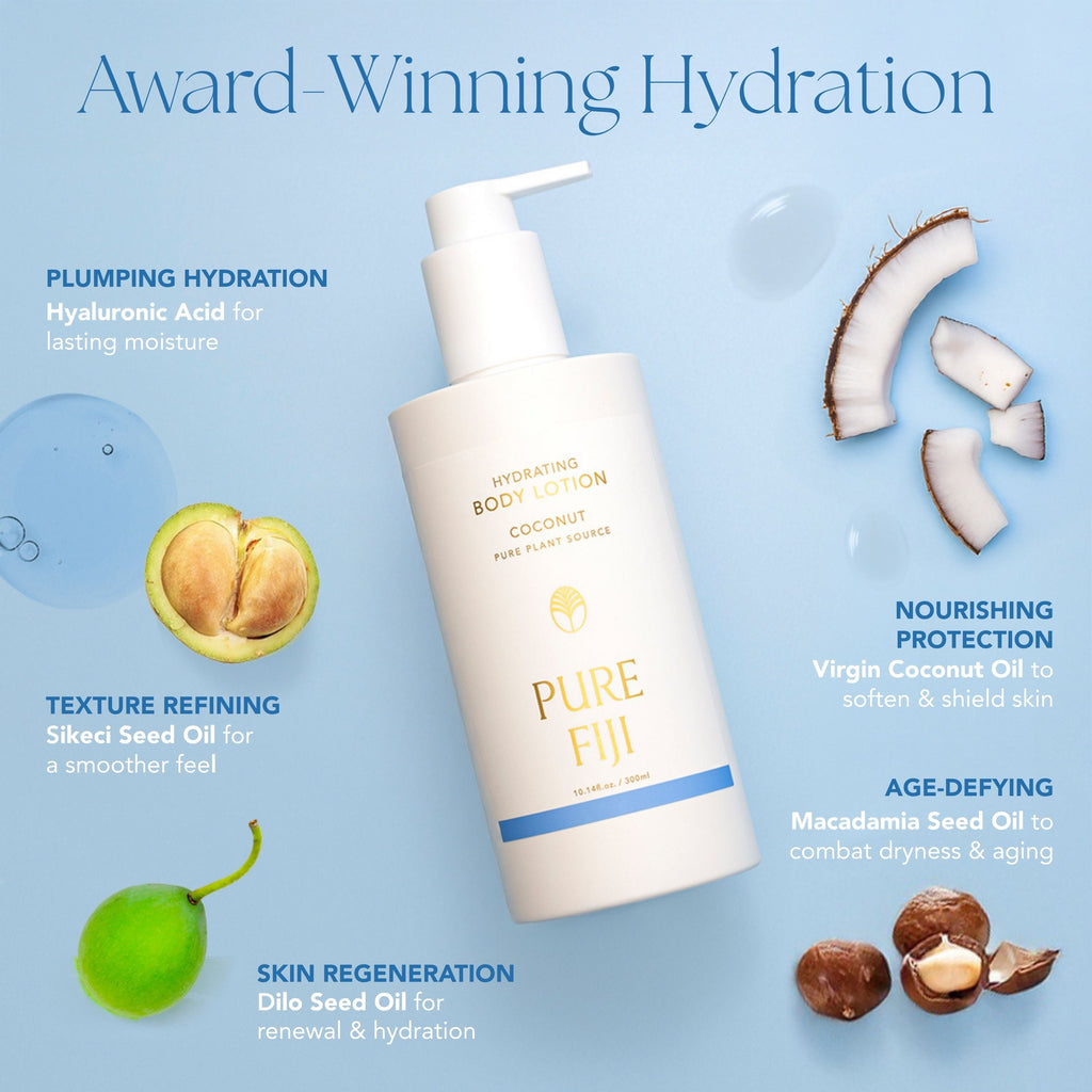 Aqua (Water), Pure Fiji Botanical Blend - Cocos Nucifera (Virgin Coconut) Oil, Calophyllum Inophyllum (Dilo) Seed Oil, Macadamia Ternifolia (Macadamia) Seed Oil, Aleurites Moluccana (Sikeci) Seed Oil, Passiflora Incarnata (Passionflower) Extract, Caprylic/CapricTriglycerides, Glycerine, Emulsifying Wax, Glyceryl Monostearate, Dimethicone, Phenoxyethanol (and) Ethylhexylglycerin (and) Caprylyl Glycol, Fragrance*, Phenyl Trimethicone, Hydrolised Hyaluronic Acid, Sclerotium Gum, Tocopheryl Acetate (Vitamin E). *contains natural essential oils.