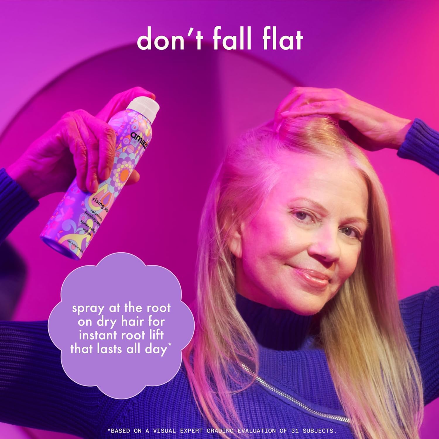 Don’t fall flat! rising star volumizing finishing spray lifts hair at the root for instant root lift that lasts all day long.
