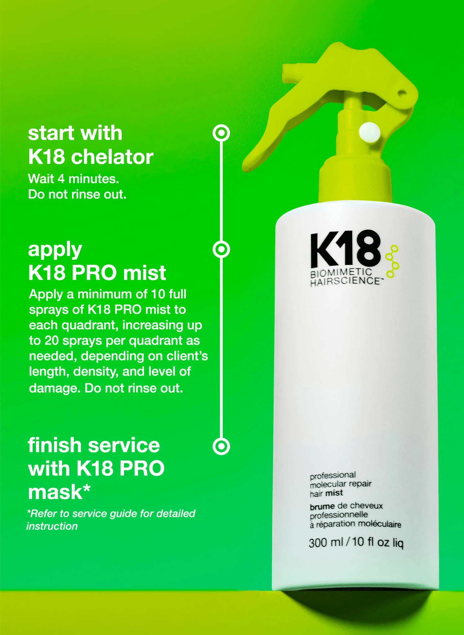 - Wait 4 minutes after chelating (do not rinse out), then apply a minimum of 10 full sprays of K18 professional molecular repair hair mist to each quadrant, increasing up to 20 sprays per quadrant as needed, depending on client’s length, density, and level of damage.