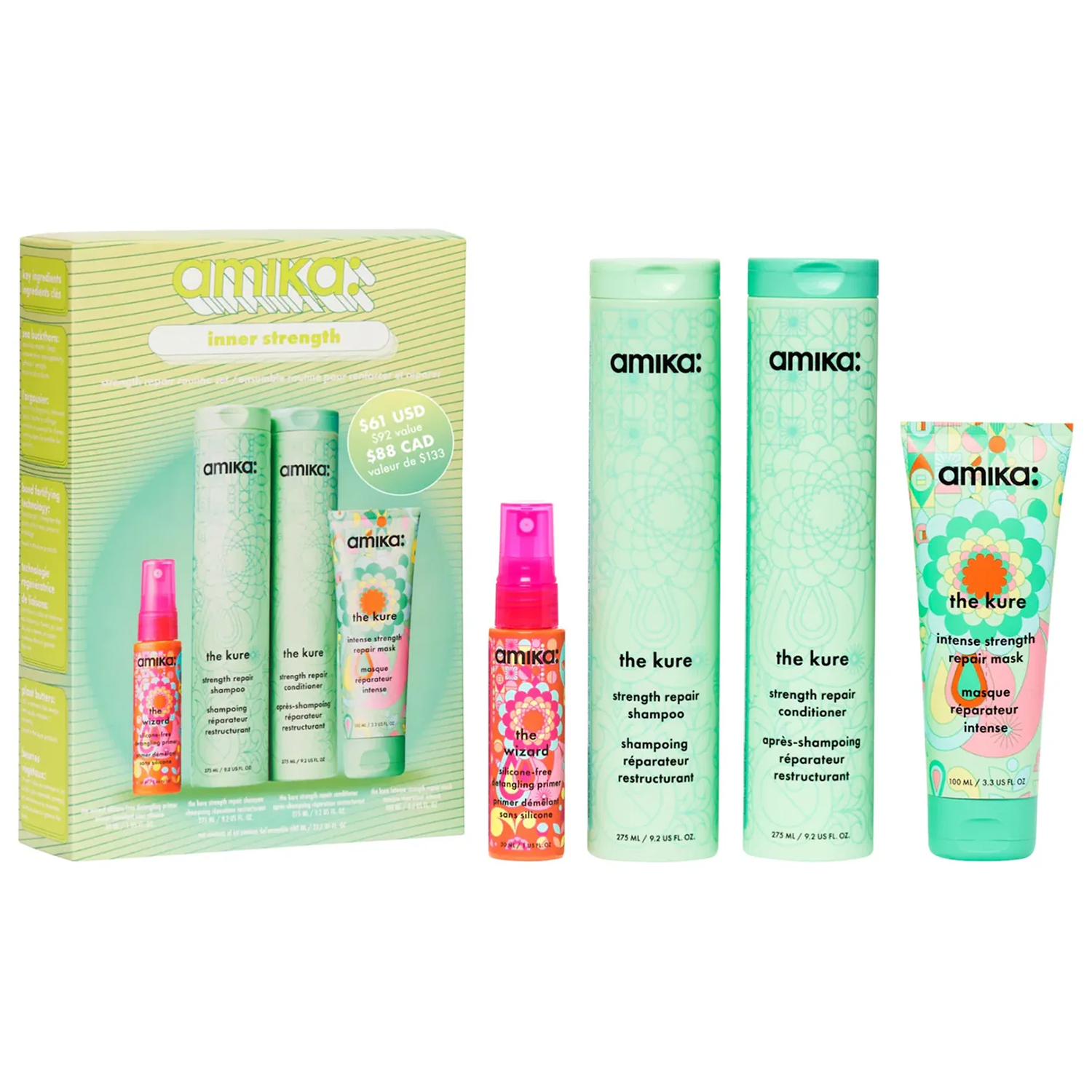 The Kure Strength Repair Shampoo:Water/Aqua/Eau, Sodium C14-16 Olefin Sulfonate, Cocamidopropyl Betaine, Glycerin, Disodium Cocoamphodiacetate, Peg-7 Glyceryl Cocoate, Hippophae Rhamnoides (Sea Buckthorn/Argousier) Fruit/Seed Oil, Borago Officinalis (Borage/Bourrache) Seed Oil, Persea Gratissima (Avocado/Avocat) Oil, Mangifera Indica (Mango/Mangue) Seed Butter, Butyrospermum Parkii (Shea/Karite) Butter, Hydroxypropyl Guar Hydroxypropyltrimonium Chloride, Lavandula Angustifolia (Lavender/Lavande) Flower Extract, Chamomilla Recutita (Matricaria/Matricaire) Flower Extract, Rosmarinus Officinalis (Rosemary/Romarin) Leaf Extract, Hydrolyzed Quinoa, Aminomethyl Propanol, Bis-Pca Dimethicone, Butylene Glycol, Disodium Edta, Disodium Peg-12 Dimethicone Sulfosuccinate, Peg-12 Dimethicone, Peg-150 Distearate, Polyquaternium-10, Polyquaternium-7, Polysorbate 20, Propylene Glycol, Glycol, Glycol Stearate, Glycol Distearate, Sodium Methyl Cocoyl Taurate, Citric Acid, Dehydroacetic Acid, Benzyl Alcohol, Phenoxyethanol, Potassium Sorbate, Sodium Benzoate, Benzoic Acid, Fragrance/Parfum, Benzyl Benzoate, Hydroxycitronellal, Limonene. The Kure Strength Repair Conditioner:Water/Aqua/Eau, Myristyl Alcohol, Propylene Glycol, Cetearyl Alcohol, Cetrimonium Chloride*, Hippophae Rhamnoides (Sea Buckthorn/Argousier) Fruit/Seed Oil, Borago Officinalis (Borage/Bourrache) Seed Oil, Mangifera Indica (Mango/Mangue) Seed Butter, Butyrospermum Parkii (Shea/Karite) Butter, Hydroxypropyl Guar Hydroxypropyltrimonium Chloride, Aloe Barbadensis Leaf Juice, Glycerin, Hydrolyzed Quinoa, Aminomethyl Propanol, Bis-Pca Dimethicone, Butylene Glycol, C11-15 Pareth-7, C12-16 Pareth-9, Caprylyl Glycol, Decyl Oleate, Disodium Peg-12 Dimethicone Sulfosuccinate, Trideceth-12, Trimethylsiloxyamodimethicone, Citric Acid, Etidronic Acid, Lauryl Alcohol, Hydrogenated Palm Glycerides Citrate, Phenoxyethanol, Potassium Sorbate, Sodium Benzoate, Cetyl Alcohol, Benzyl Alcohol, Tocopherol, Fragrance/Parfum, Benzyl Benzoate, Hydroxycitronellal, Limonene *Antistatic Agent/Agent Antistatique. The Kure Intense Strength Repair Mask:Water/Aqua/Eau, Cetearyl Alcohol, Cetyl Alcohol, Isopropyl Myristate, Behentrimonium Chloride*, Dimethicone, Glycerin, Panthenol, Hippophae Rhamnoides (Sea Buckthorn/Argousier) Fruit/Seed Oil, Borago Officinalis (Borage/Bourrache) Seed Oil, Mangifera Indica (Mango/Mangue) Seed Butter, Butyrospermum Parkii (Shea/Karite) Butter, Hydroxypropyl Guar Hydroxypropyltrimonium Chloride, Hydrolyzed Quinoa, Tocopheryl Acetate, Cetrimonium Chloride*, Magnesium Aluminum Silicate, Butylene Glycol, Bis-Pca Dimethicone, Disodium Peg-12 Dimethicone Sulfosuccinate, Aminomethyl Propanol, Chlorphenesin, Bht, Ethylhexylglycerin, Citric Acid, Isopropyl Alcohol, Phenoxyethanol, Benzyl Alcohol, Potassium Sorbate, Sodium Benzoate, Fragrance/Parfum, Benzyl Benzoate, Hydroxycitronellal, Limonene *Antistatic Agent/Agent Antistatique. The Wizard Silicone-Free Detangling Primer:Isododecane, Isopropyl Palmitate, Isohexadecane, Ethylhexyl Olivate, Hippophae Rhamnoides (Sea Buckthorn/Argousier) Fruit/Seed Oil, Squalane, Persea Gratissima (Avocado/Avocat) Oil, Tocopheryl Acetate, Fragrance/Parfum.