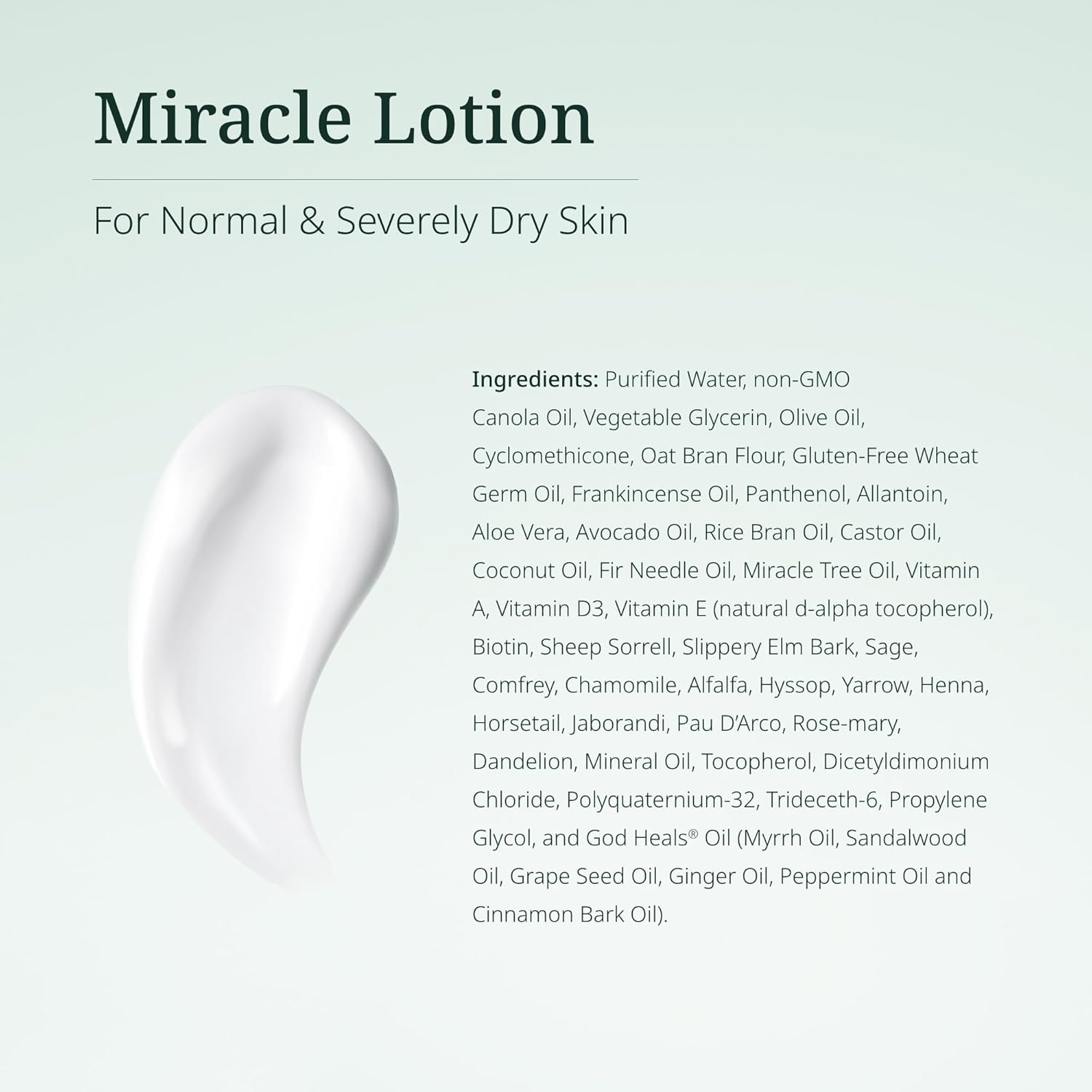 Natural Well Water, Non-GMO Canola Oil, Vegetable Glycerin, Olive Oil, Cyclomethicone, Oat Bran Flour, Gluten-Free Wheat Germ Oil, Frankincense Oil, Panthenol, Allantoin, Aloe Vera, Avocado Oil, Rice Bran Oil, Castor Oil, Coconut Oil, Fir Needle Oil, Miracle Tree Oil, Vitamin A, Vitamin D3, Vitamin E (natural d-alpha tocopherol), Biotin, Sheep Sorrel, Slippery Elm Bark, Sage, Comfrey, Chamomile, Alfalfa, Hyssop, Yarrow, Henna, Horsetail, Jaborandi, Pau D'Arco, Rosemary, Dandelion, Mineral Oil, Tocopherol, Dicetyldimonium, Chloride, Polyquaternium-32, Trideceth-6, Propylene Glycol, and God Heals Oil from GodHealsOil.com (Myrrh Oil, Sandalwood Oil, Grape Seed Oil, Ginger Oil, Peppermint Oil and Cinnamon Bark Oil).